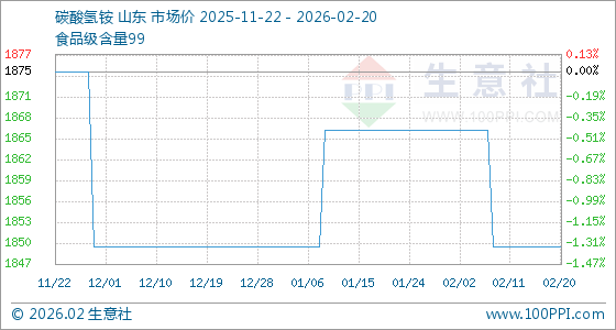 2月20日,生意社碳酸氢铵基准价为1850.00元/吨,与本月初(1866.67元/吨)相比,下降了0.89%。