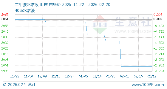 2月20日,生意社二甲胺水溶液基准价为2000.00元/吨,与本月初持平。