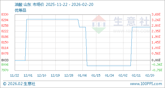 2月20日,生意社油酸基准价为8250.00元/吨,与本月初(8000.00元/吨)相比,上涨了3.12%。