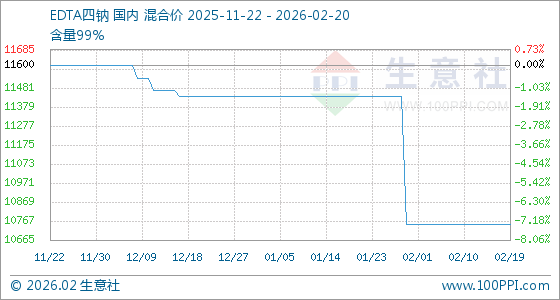 2月20日,生意社EDTA四钠基准价为10750.00元/吨,与本月初持平。