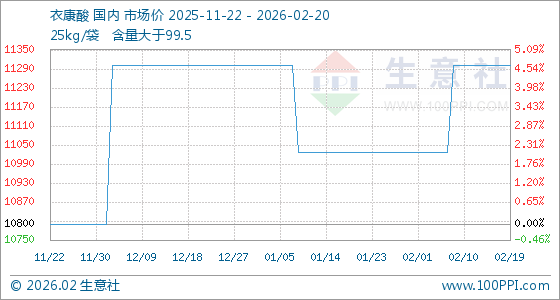 2月20日,生意社衣康酸基准价为11300.00元/吨,与本月初(11025.00元/吨)相比,上涨了2.49%。