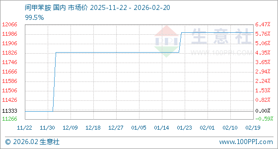 2月20日,生意社间甲苯胺基准价为12000.00元/吨,与本月初持平。