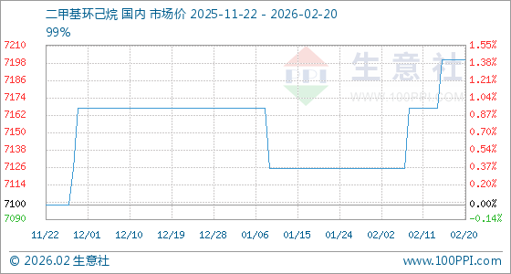 2月20日,生意社二甲基环己烷基准价为7200.00元/吨,与本月初(7125.00元/吨)相比,上涨了1.05%。