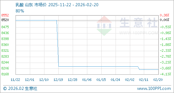 2月20日,生意社乳酸基准价为8200.00元/吨,与本月初(8220.00元/吨)相比,下降了0.24%。