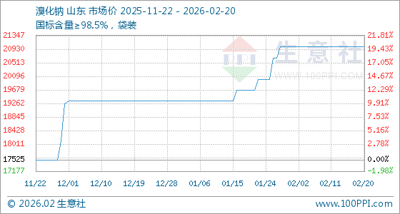 2月20日,生意社溴化钠基准价为21000.00元/吨,与本月初持平。