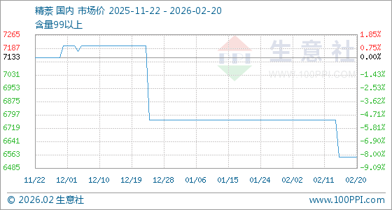 2月20日,生意社精萘基准价为6550.00元/吨,与本月初(6766.67元/吨)相比,下降了3.2%。
