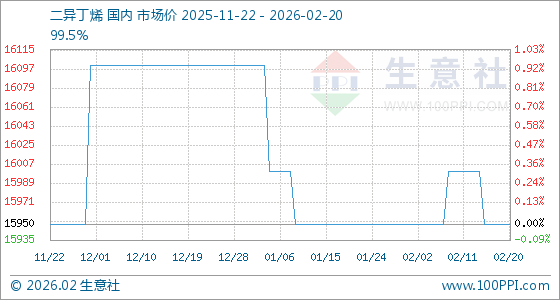 2月20日,生意社二异丁烯基准价为15950.00元/吨,与本月初持平。