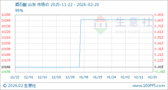 2月20日,生意社酒石酸基准价为10250.00元/吨,与本月初持平。