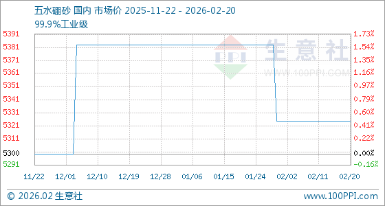 2月20日,生意社五水硼砂基准价为5325.00元/吨,与本月初持平。