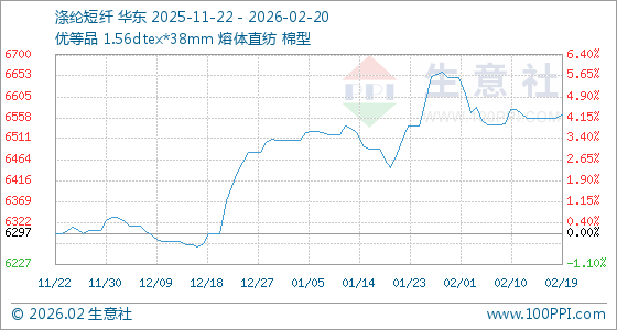 2月20日,生意社涤纶短纤基准价为6565.52元/吨,与本月初(6649.67元/吨)相比,下降了1.27%。