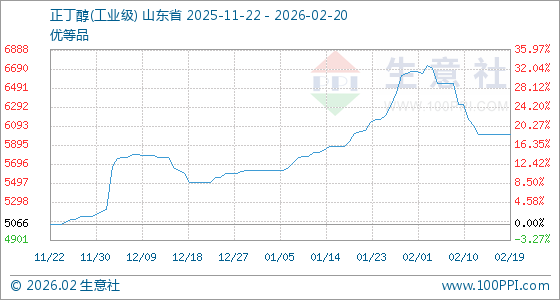 2月20日,生意社正丁醇(工业级)基准价为6000.00元/吨,与本月初(6663.33元/吨)相比,下降了9.95%。