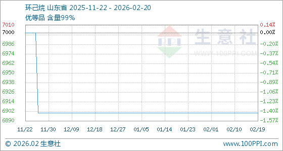 2月20日,生意社环己烷基准价为6900.00元/吨,与本月初持平。