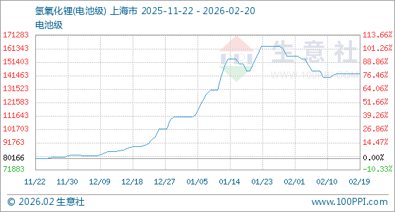 2月20日,生意社氢氧化锂(电池级)基准价为143000.00元/吨,与本月初(156000.00元/吨)相比,下降了8.33%。