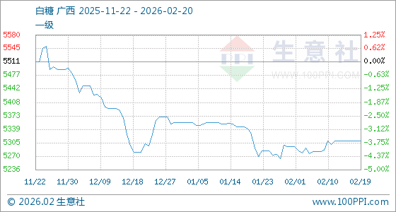 2月20日,生意社白糖基准价为5310.00元/吨,与本月初(5295.00元/吨)相比,上涨了0.28%。