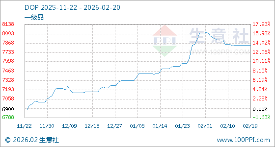 2月20日,生意社DOP基准价为7833.34元/吨,与本月初(8017.50元/吨)相比,下降了2.3%。