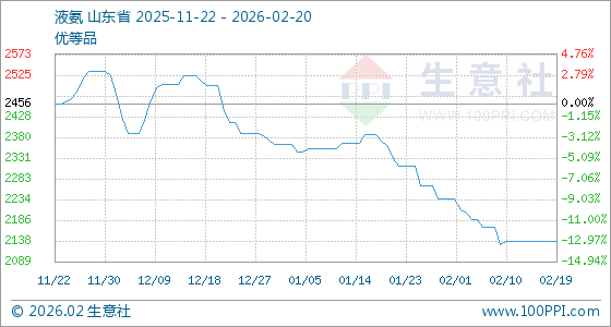 2月20日,生意社液氨基准价为2136.67元/吨,与本月初(2236.67元/吨)相比,下降了4.47%。