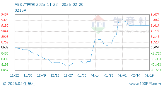 2月20日,生意社ABS基准价为9193.33元/吨,与本月初(9350.00元/吨)相比,下降了1.68%。