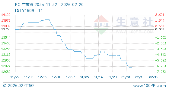 2月20日,生意社PC基准价为12836.67元/吨,与本月初(12966.67元/吨)相比,下降了1%。