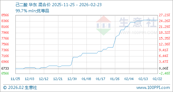 2月23日,生意社己二酸基准价为8400.00元/吨,与本月初(8066.67元/吨)相比,上涨了4.13%。