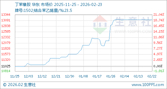 2月23日,生意社丁苯橡胶基准价为13125.00元/吨,与本月初(13133.33元/吨)相比,下降了0.06%。