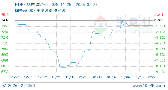 2月23日,生意社HDPE基准价为7375.00元/吨,与本月初(7337.50元/吨)相比,上涨了0.51%。