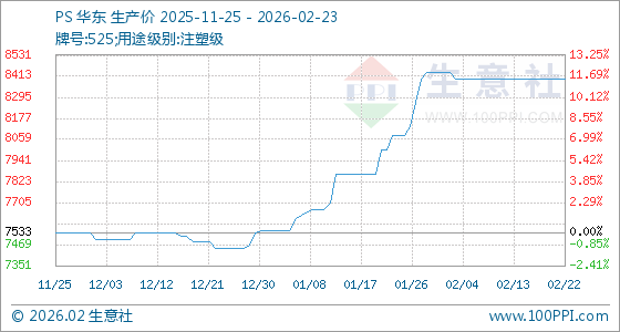 2月23日,生意社PS基准价为8400.00元/吨,与本月初(8433.33元/吨)相比,下降了0.4%。