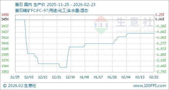 2月23日,生意社萤石基准价为3425.00元/吨,与本月初(3418.75元/吨)相比,上涨了0.18%。