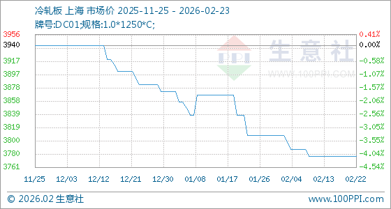 2月23日,生意社冷轧板基准价为3777.50元/吨,与本月初(3807.50元/吨)相比,下降了0.79%。