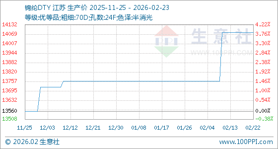2月23日,生意社锦纶DTY基准价为14080.00元/吨,与本月初(13760.00元/吨)相比,上涨了2.33%。