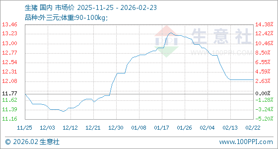 2月23日,生意社生猪基准价为12.12元/公斤,与本月初(12.98元/公斤)相比,下降了6.63%。