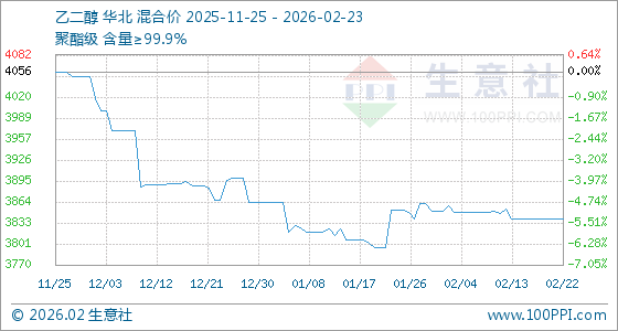 2月23日,生意社乙二醇基准价为3838.33元/吨,与本月初(3850.00元/吨)相比,下降了0.3%。