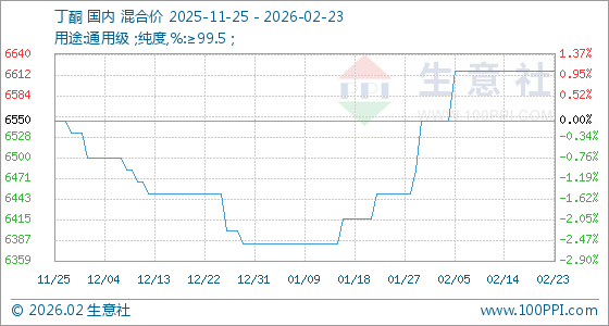 2月23日,生意社丁酮基准价为6616.67元/吨,与本月初(6550.00元/吨)相比,上涨了1.02%。