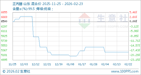 2月23日,生意社正丙醇基准价为5300.00元/吨,与本月初(5500.00元/吨)相比,下降了3.64%。