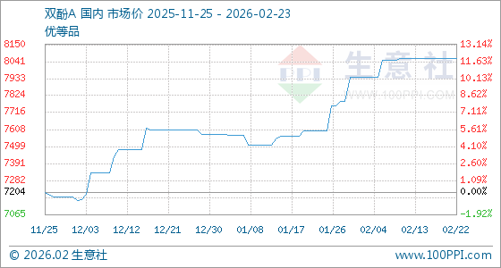 2月23日,生意社双酚A基准价为8060.00元/吨,与本月初(7940.00元/吨)相比,上涨了1.51%。