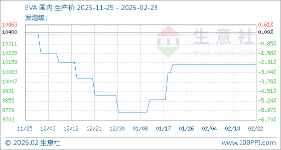 2月23日,生意社EVA基准价为10150.00元/吨,与本月初持平。