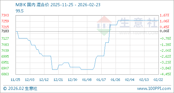 2月23日,生意社MIBK基准价为7266.67元/吨,与本月初持平。