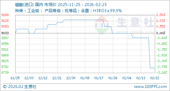 2月23日,生意社硼酸(进口)基准价为8775.00元/吨,与本月初(9033.33元/吨)相比,下降了2.86%。