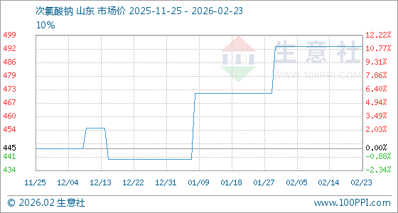 2月23日,生意社次氯酸钠基准价为494.00元/吨 ,与本月初持平。