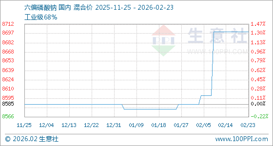 2月23日,生意社六偏磷酸钠基准价为8700.00元/吨 ,与本月初(8585.71元/吨 )相比,上涨了1.33%。