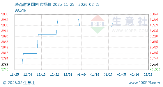 2月23日,生意社过硫酸铵基准价为3950.00元/吨,与本月初持平。