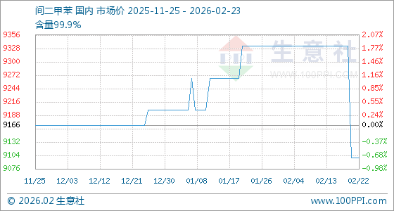 2月23日,生意社间二甲苯基准价为9100.00元/吨,与本月初(9333.33元/吨)相比,下降了2.5%。