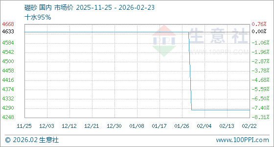2月23日,生意社硼砂基准价为4283.33元/吨,与本月初持平。