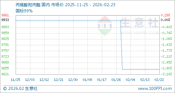 2月23日,生意社丙烯酸羟丙酯基准价为9650.00元/吨,与本月初持平。