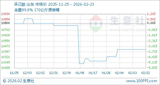 2月23日,生意社环己胺基准价为10433.33元/吨,与本月初(10333.33元/吨)相比,上涨了0.97%。