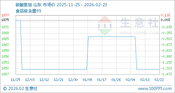 2月23日,生意社碳酸氢铵基准价为1850.00元/吨,与本月初(1866.67元/吨)相比,下降了0.89%。