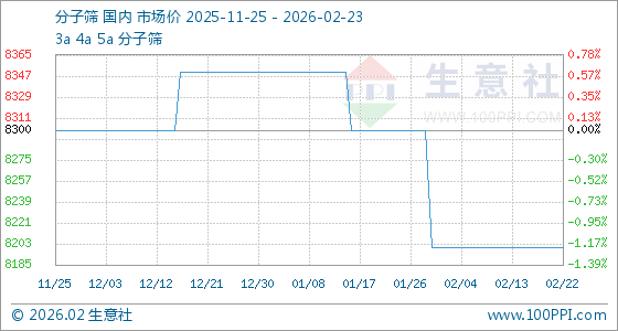 2月23日,生意社分子筛基准价为8200.00元/吨,与本月初持平。