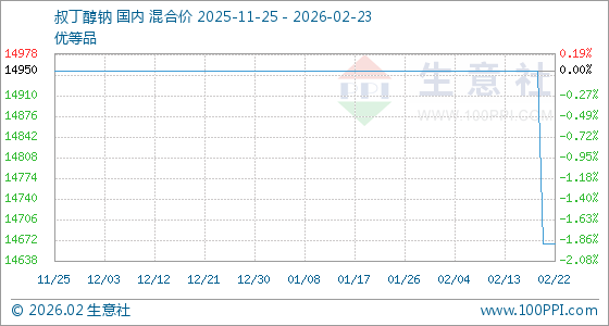 2月23日,生意社叔丁醇钠基准价为14666.67元/吨,与本月初(14950.00元/吨)相比,下降了1.9%。