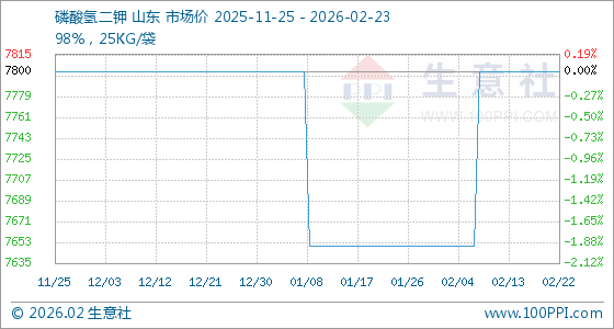 2月23日,生意社磷酸氢二钾基准价为7800.00元/吨,与本月初(7650.00元/吨)相比,上涨了1.96%。