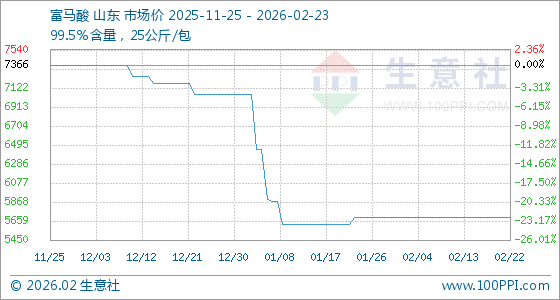 2月23日,生意社富马酸基准价为5700.00元/吨,与本月初持平。