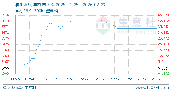 2月23日,生意社氯化亚砜基准价为2750.00元/吨,与本月初持平。